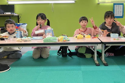 お昼になった食事の時間。「クッキング」がある日は、みんなで力を合わせてご飯を作ります!